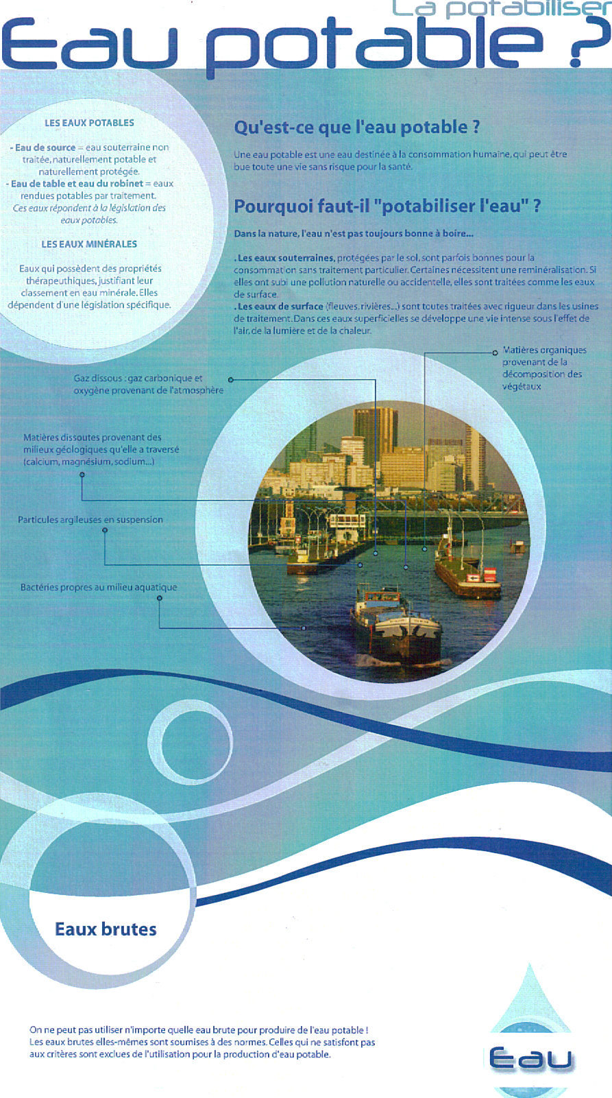Le discours tenu dans les brochures mises à la disposition du public est pour le moins sujet à caution. L’une d’entre elle pose la question d’apparence anodine: Pourquoi faut-il « potabiliser l’eau »? Excellente question. La réponse est très étonnante, je cite: dans la nature l’eau n’est pas toujours bonne à boire… Nous voila prévenus.